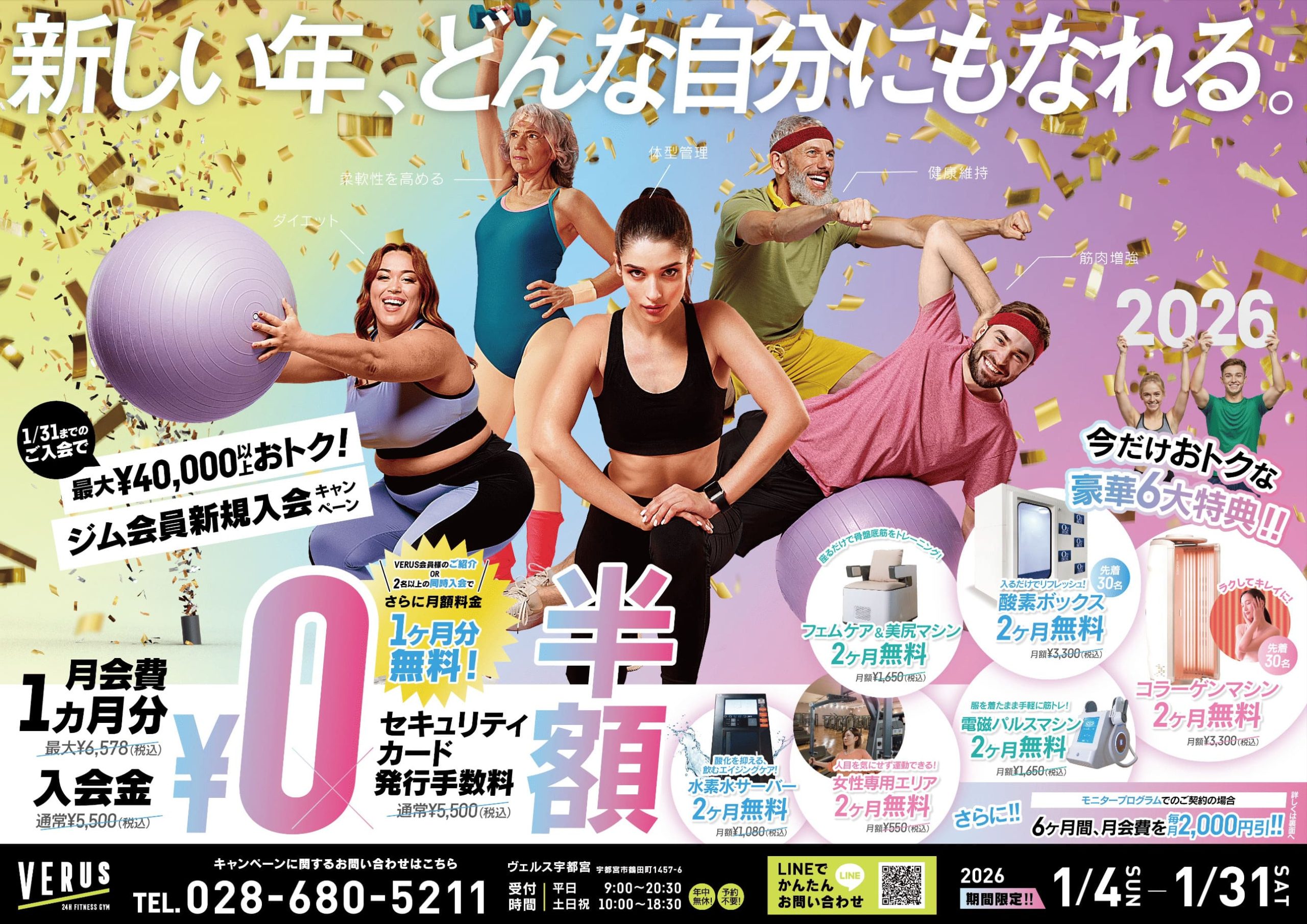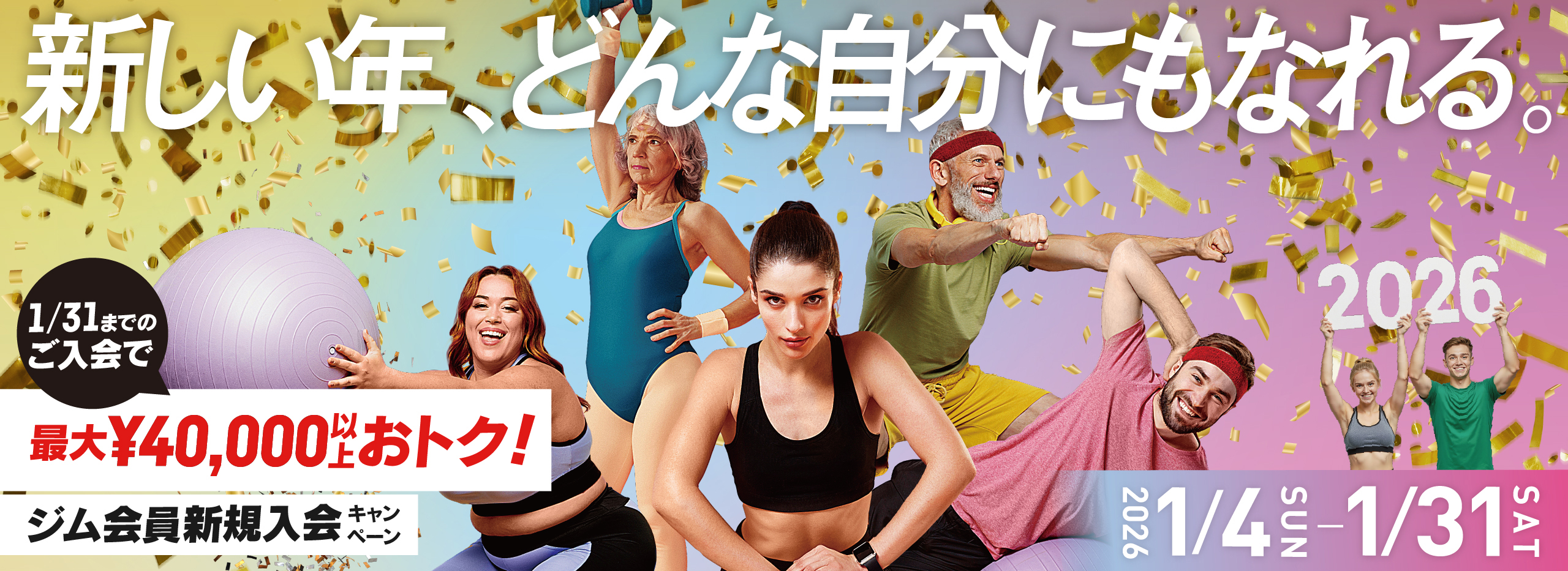 当ジムでは、新年のスタートに合わせて、皆さまの新たな挑戦を後押しする期間限定キャンペーンを実施いたします。 運動を始めたい方、体型を変えたい方、健康づくりに取り組みたい方など、目標は人それぞれ。ご自身のペースで一歩を踏み出せるよう、通い方や取り組み方を含めてサポートいたします。